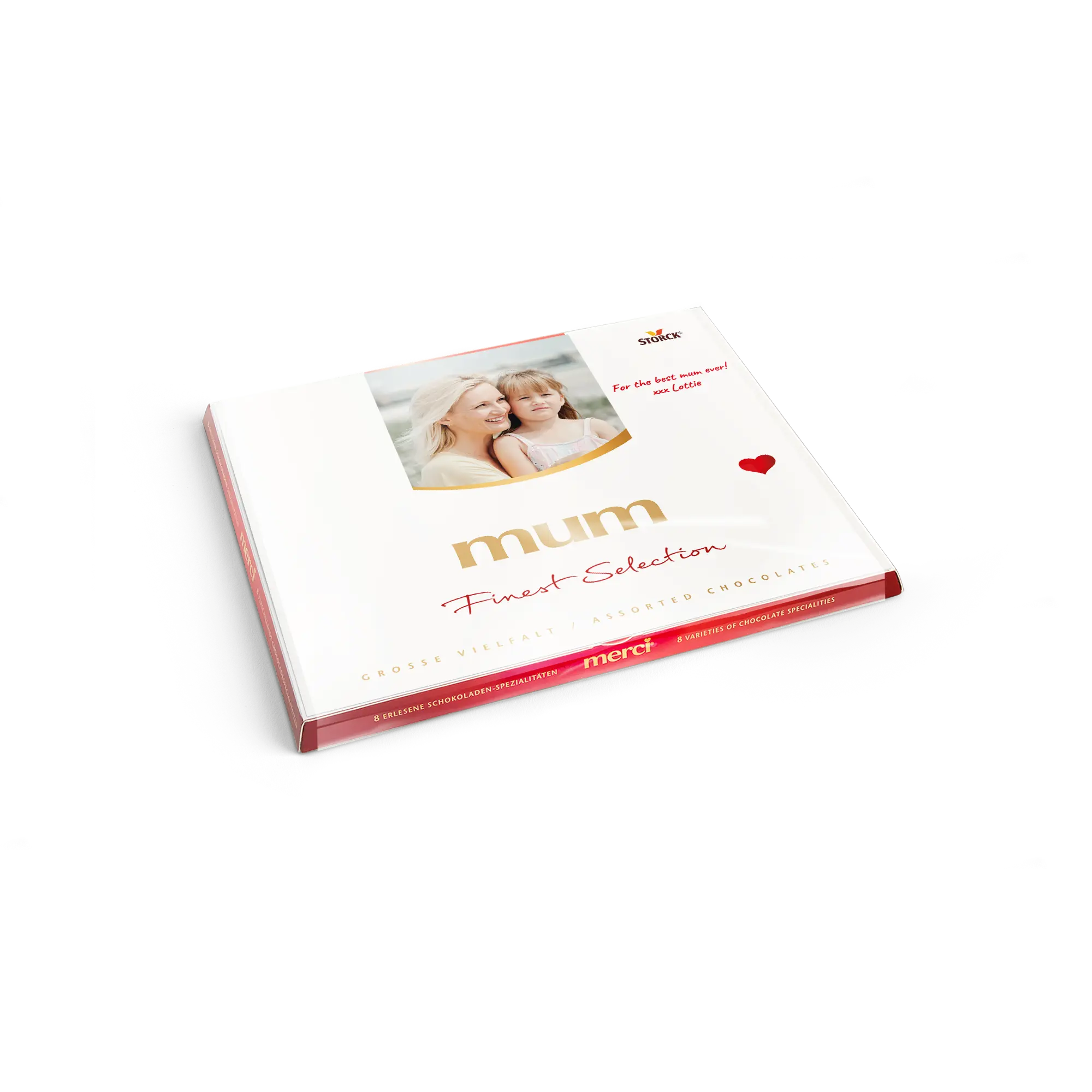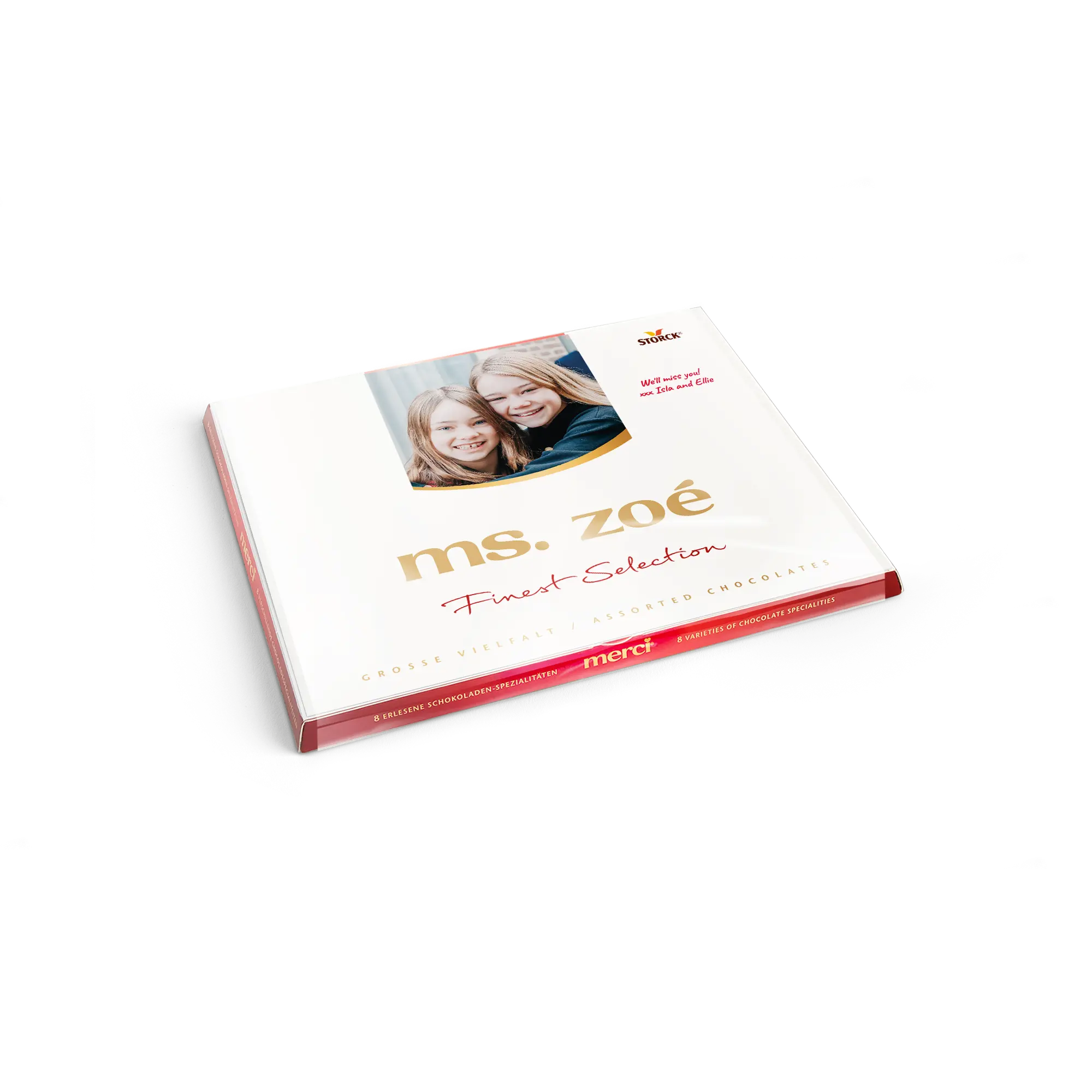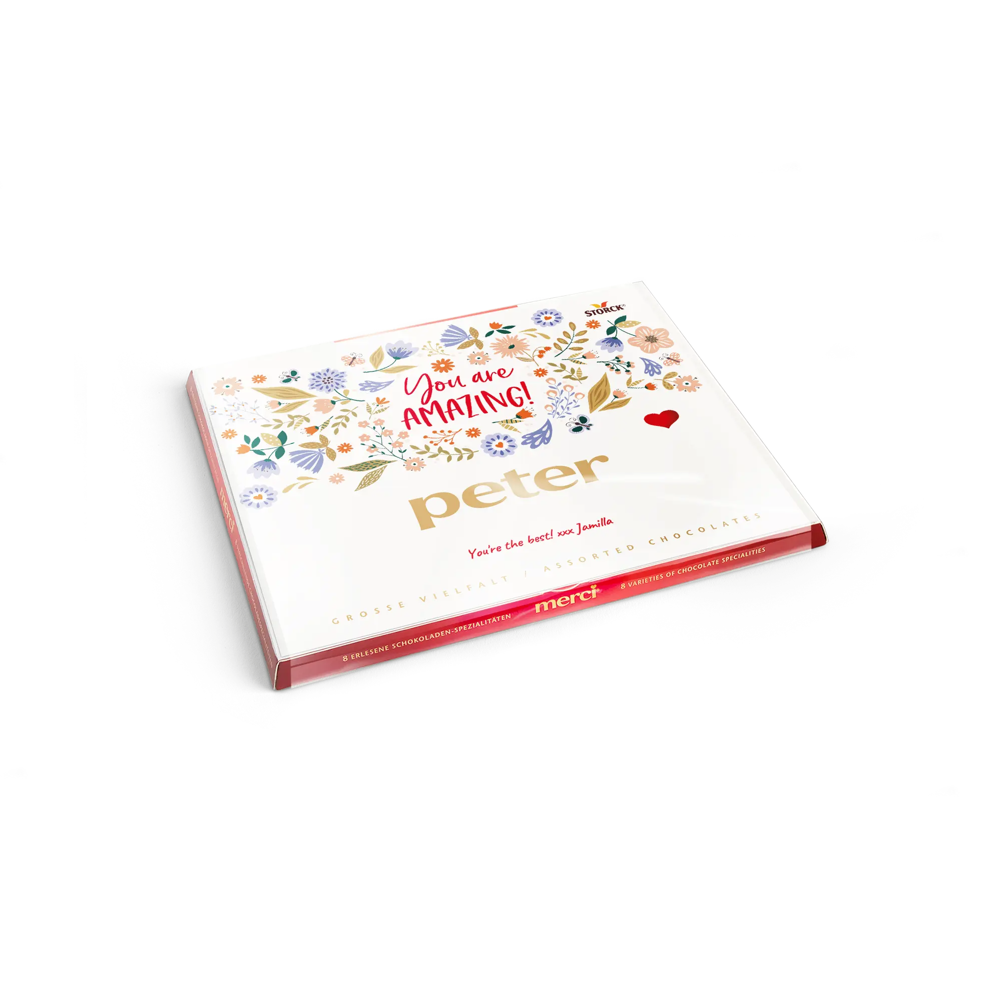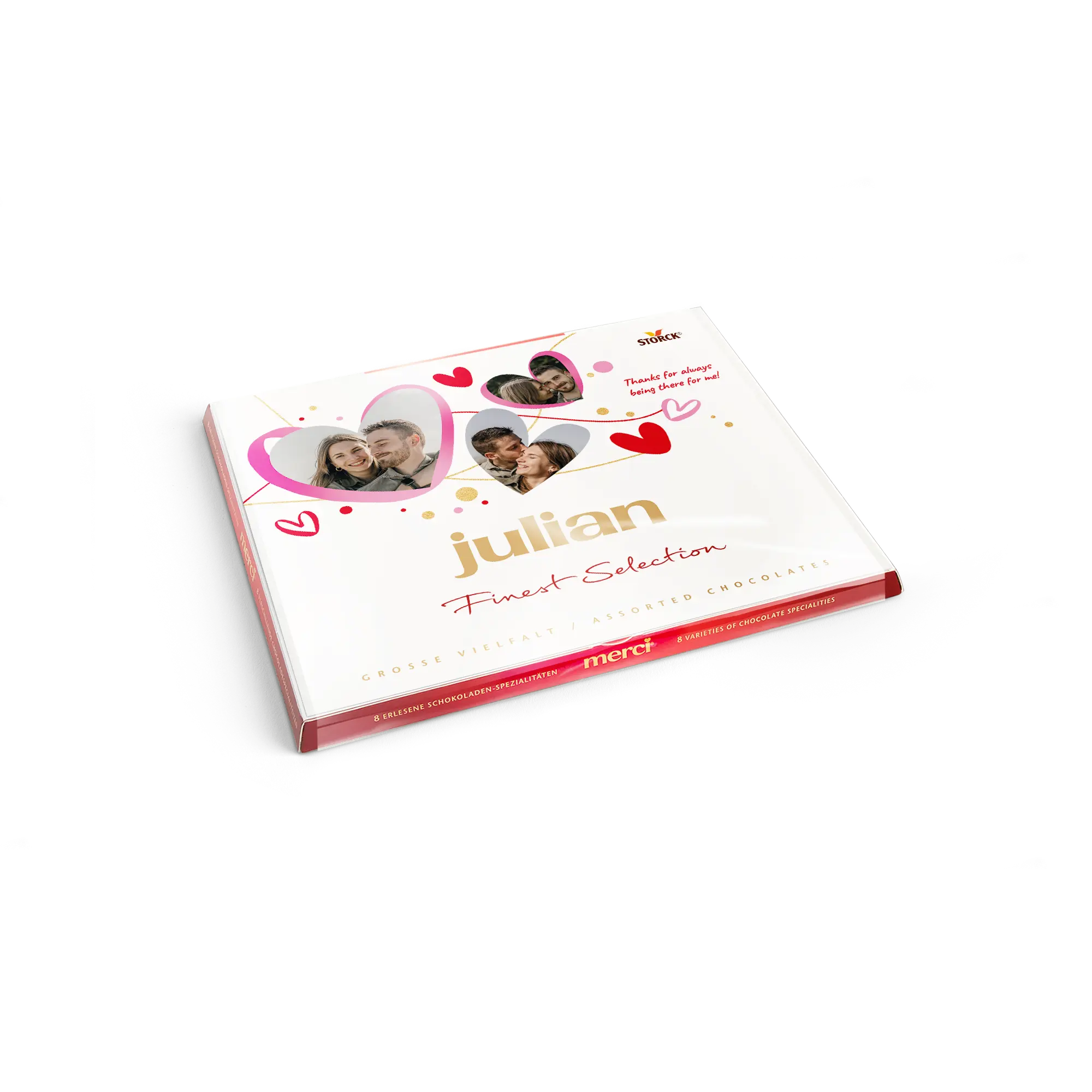 Una scatola di cioccolatini Merci con un biglietto personalizzato che presenta la foto, il nome e/o il testo di tua scelta. Design classico Merci!Ulteriori informazioni sui cioccolatini Merci: Cioccolato: Un mix di cioccolato al latte, pralina di latte, cioccolato alle nocciole e mandorle, pralina di nocciole, cioccolato fondente, crema al caffè, mousse al cioccolato fondente, marzapane Numero di cioccolatini: 20 Peso: 250 grammi Dimensioni della scatola: 19,5 x 16 x 1,5 cm Dimensioni del biglietto piegato: 18,5 x 14,8 cm Personalizzazione: con nome, foto e messaggio personale Stampa: perfetta e a colori vivaci Quando la temperatura esterna è di 25 gradi Celsius o superiore non possiamo garantire la qualità del cioccolato. Se hai domande riguardo ai tuoi ordini di cioccolato, ti preghiamo di contattare il nostro servizio clienti. Per motivi tecnici, non è possibile utilizzare caratteri cirillici, turchi, asiatici, arabi, greci o caratteri speciali.