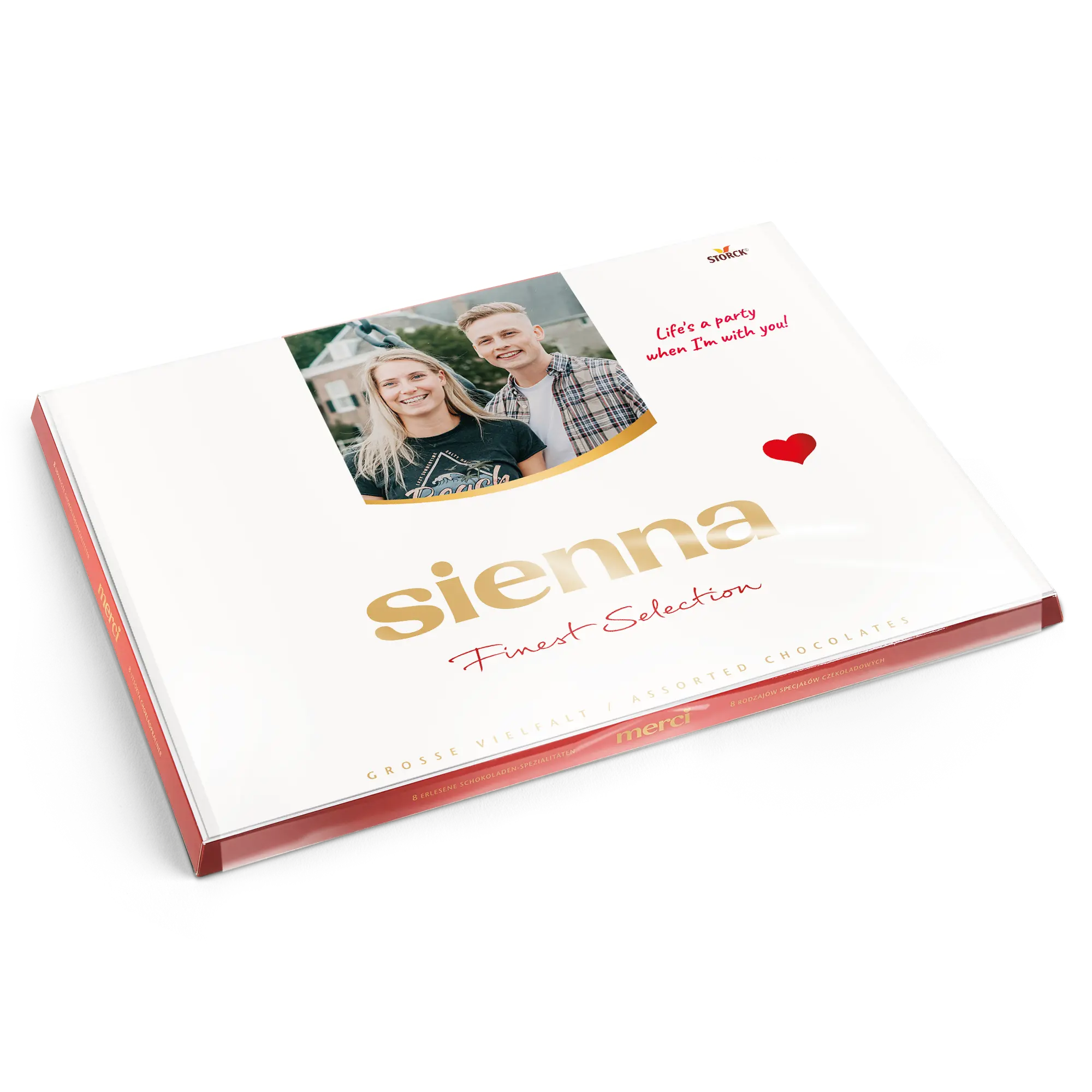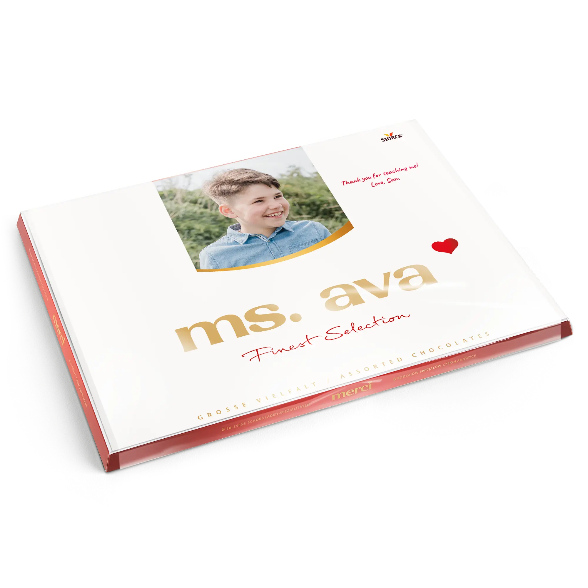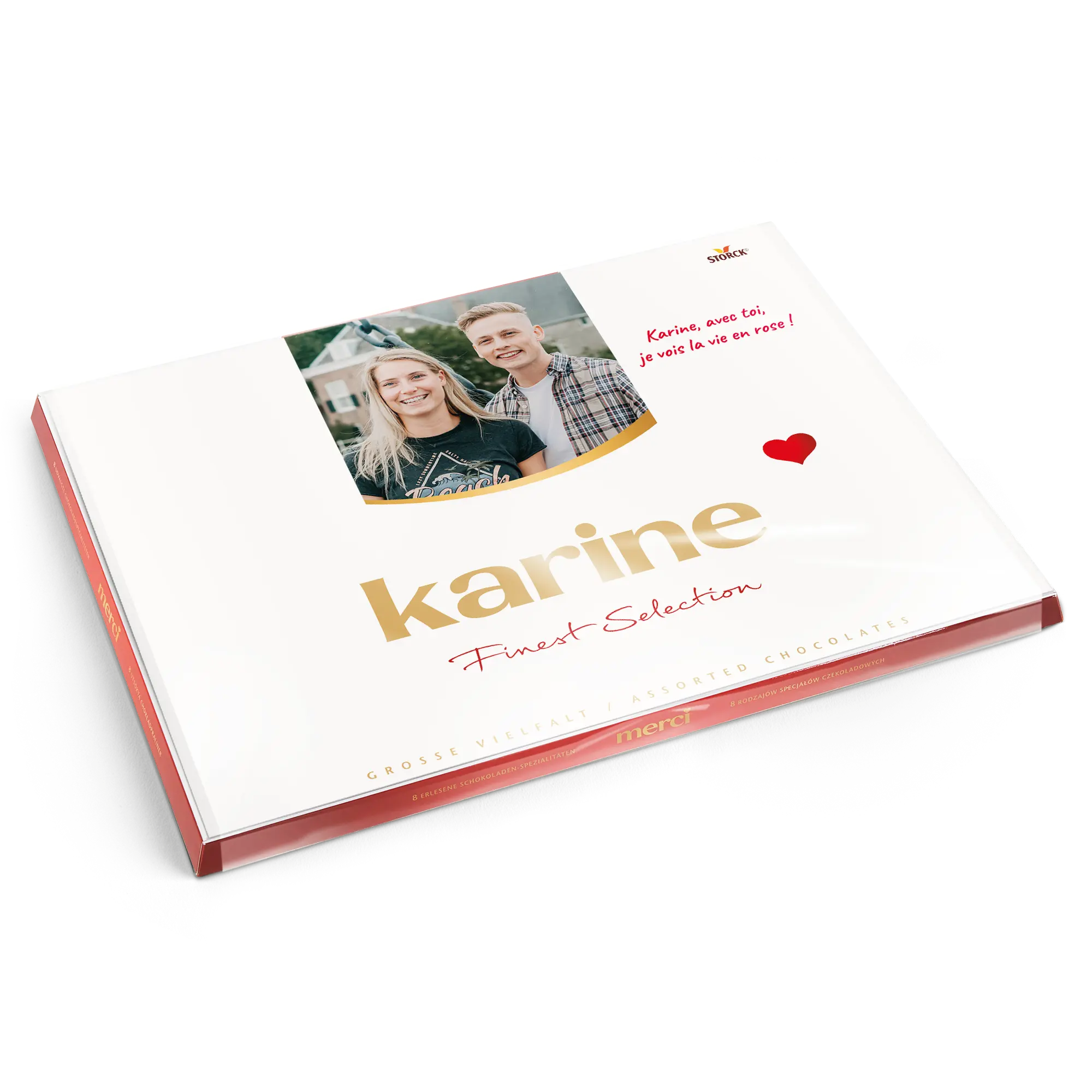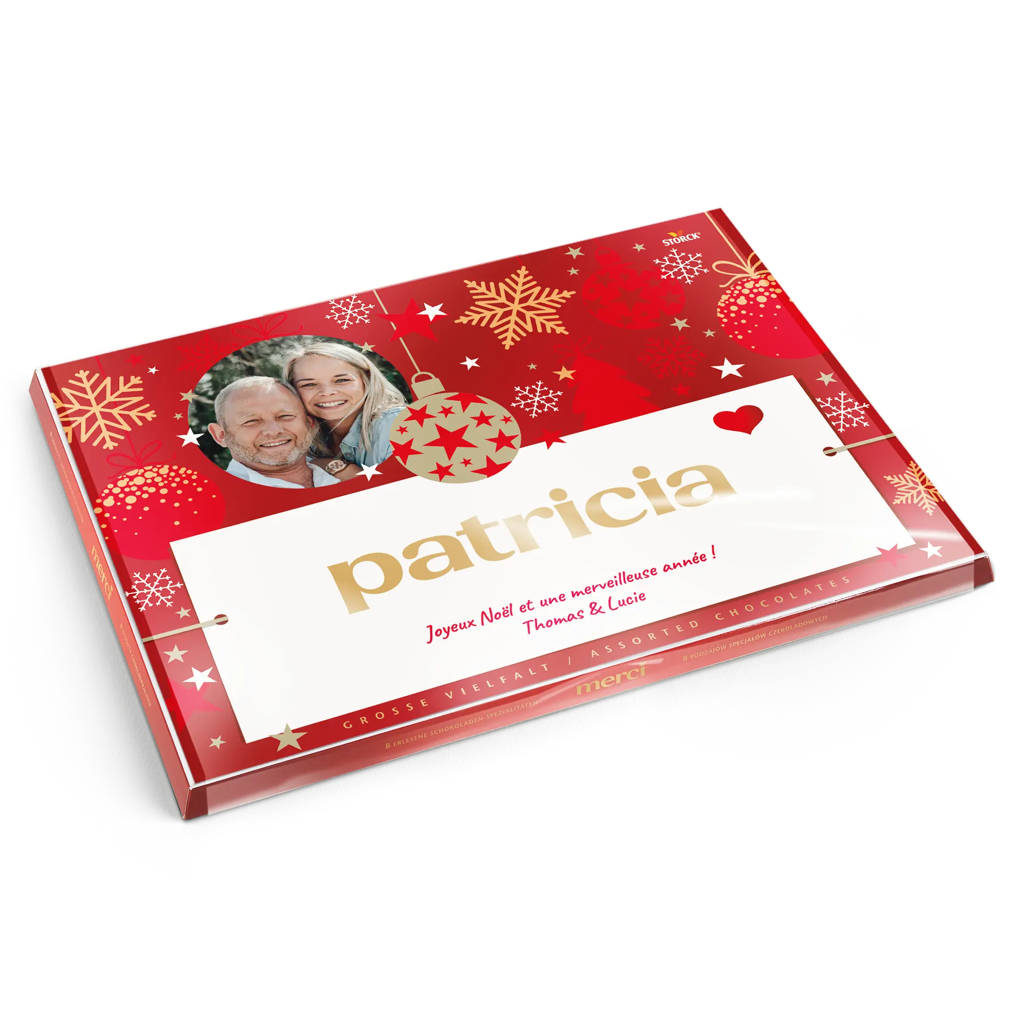 Una scatola di cioccolatini Merci con un biglietto personalizzato che presenta la foto, il nome e/o il testo di tua scelta. Design classico di Merci!Ulteriori informazioni sui cioccolatini Merci:Cioccolato: Un mix di cioccolato al latte, pralinato al latte, cioccolato alle nocciole e mandorle, pralinato di nocciole, cioccolato fondente, crema al caffè, mousse al cioccolato fondente, marzapaneNumero di cioccolatini: 54Peso: 675 grammiDimensioni della scatola: 37 x 27 x 1,5 cmDimensioni del biglietto piegato: 36,7 x 26,8 cmPersonalizzazione: con nome, foto e messaggio personaleStampa: perfetta e a colori vivaciQuando la temperatura esterna è di 25 gradi Celsius o superiore, non possiamo garantire la qualità del cioccolato. Se hai domande riguardo ai tuoi ordini di cioccolato, ti preghiamo di contattare il nostro servizio clienti. Per motivi tecnici, non è possibile utilizzare caratteri cirillici, turchi, asiatici, arabi, greci o caratteri speciali.