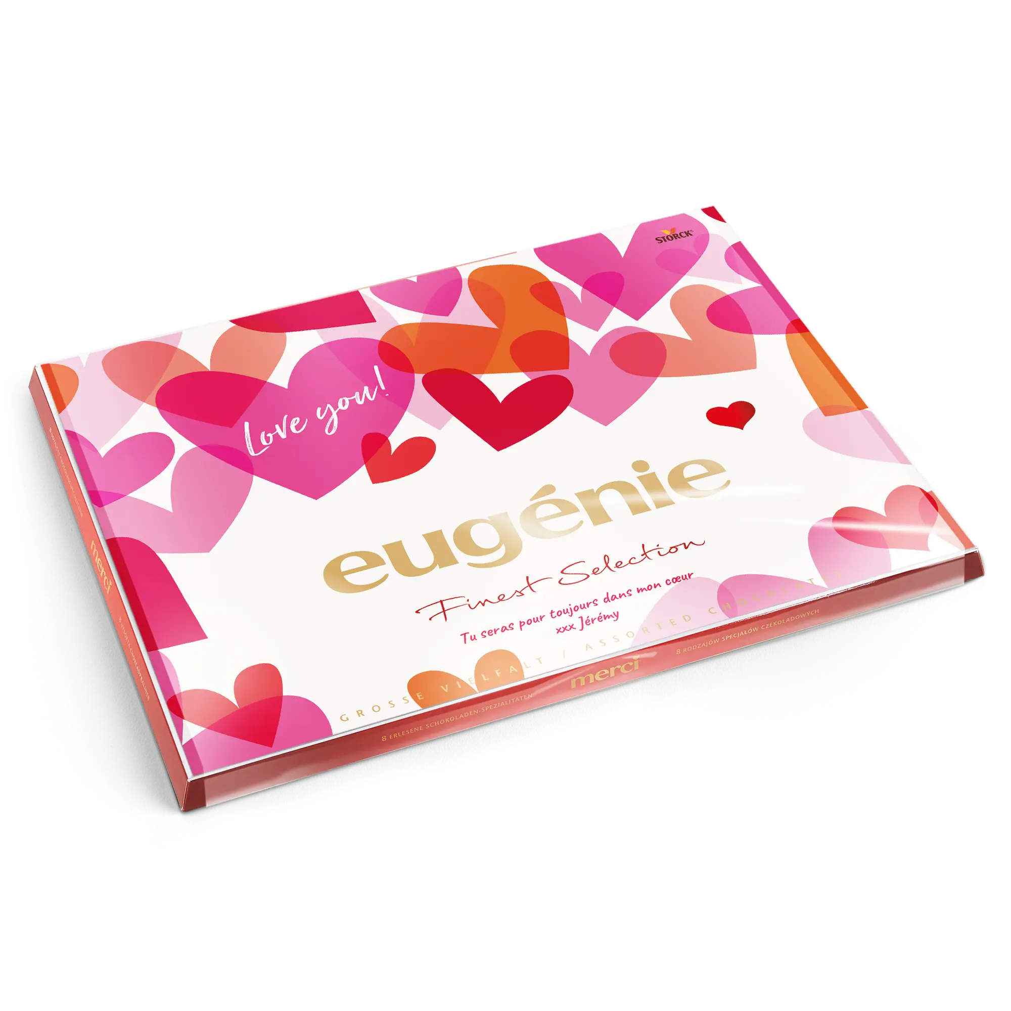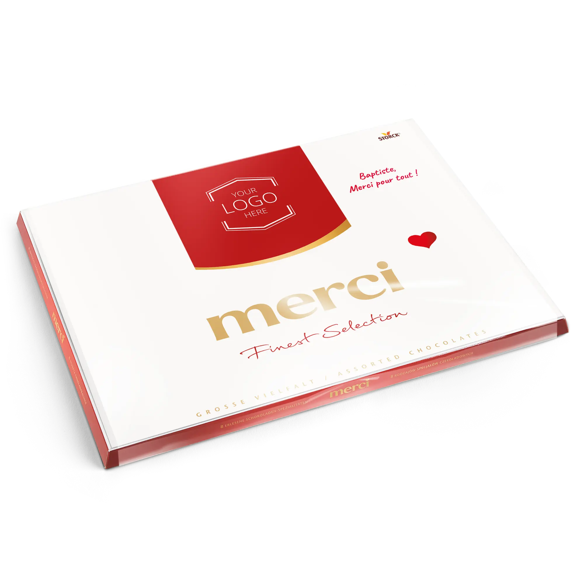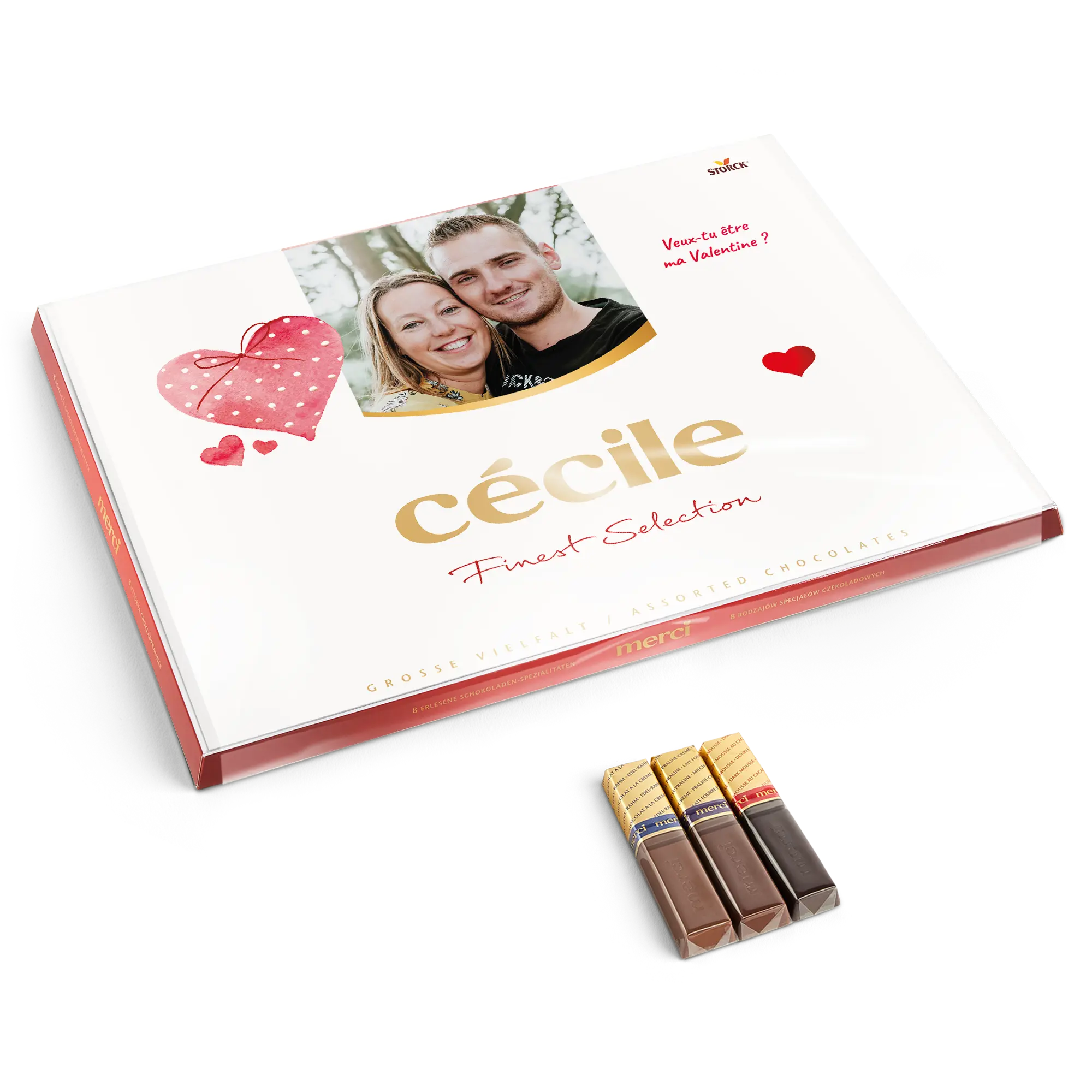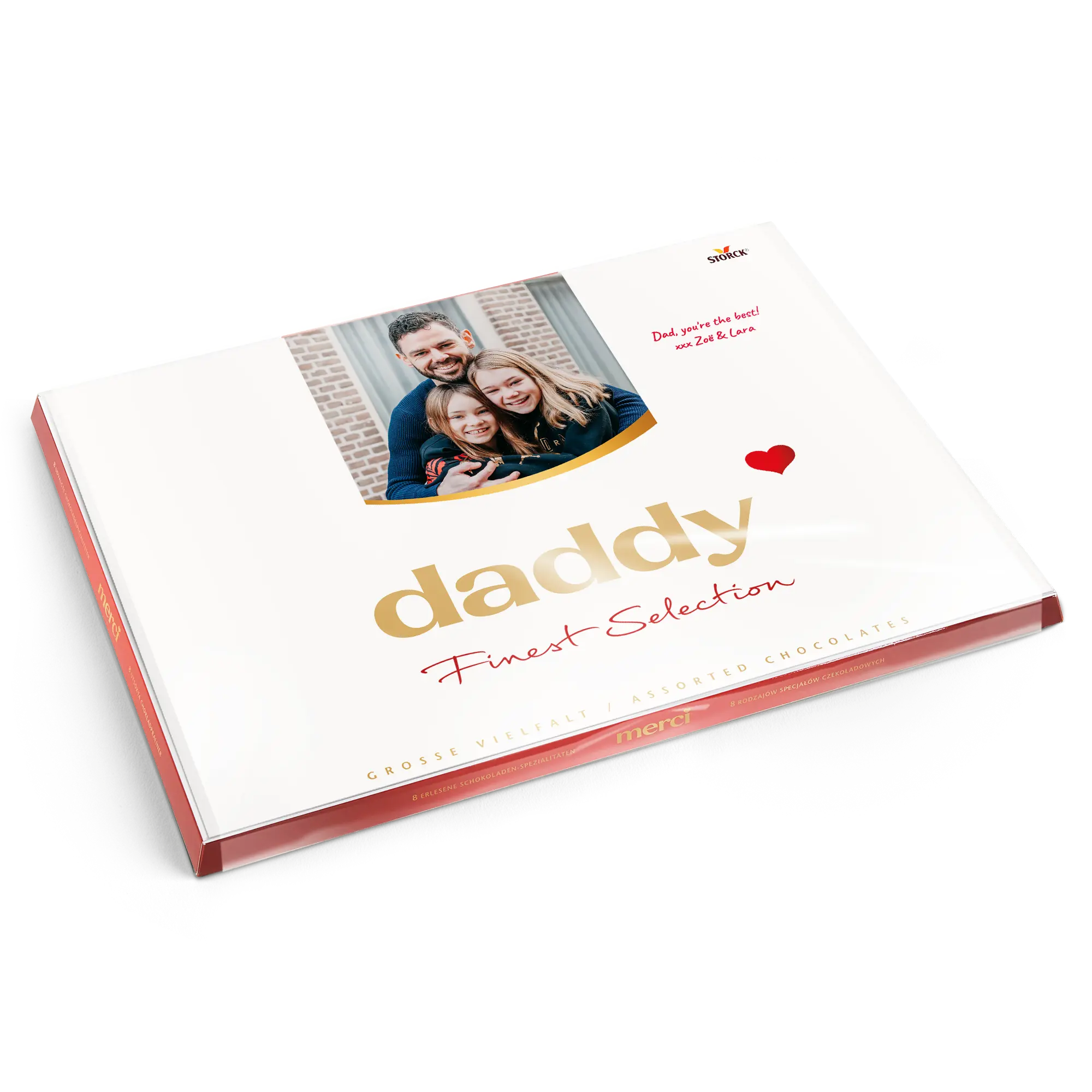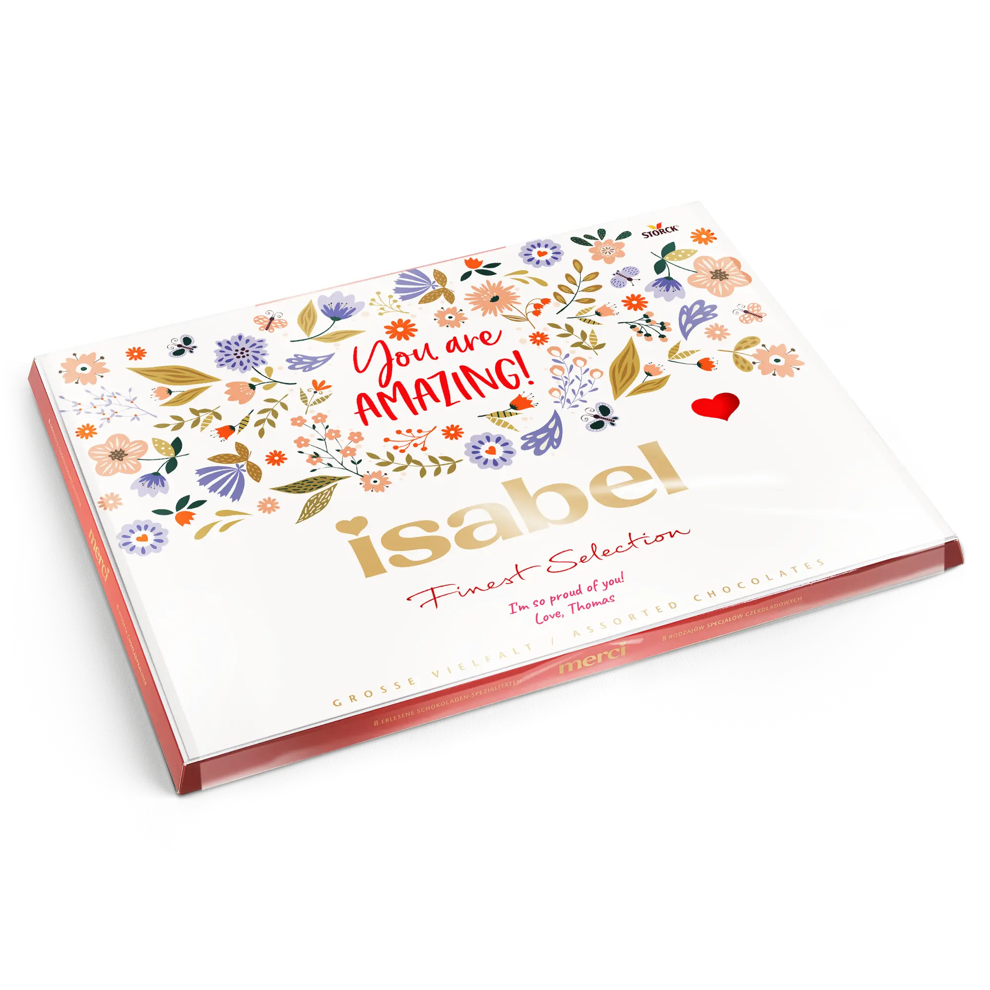 Una scatola di cioccolatini Merci con un biglietto personalizzato che presenta la foto, il nome e/o il testo di tua scelta. Design classico di Merci!Ulteriori informazioni sui cioccolatini Merci:Cioccolato: Un mix di cioccolato al latte, pralinato al latte, cioccolato alle nocciole e mandorle, pralinato di nocciole, cioccolato fondente, crema al caffè, mousse al cioccolato fondente, marzapaneNumero di cioccolatini: 54Peso: 675 grammiDimensioni della scatola: 37 x 27 x 1,5 cmDimensioni del biglietto piegato: 36,7 x 26,8 cmPersonalizzazione: con nome, foto e messaggio personaleStampa: perfetta e a colori vivaciQuando la temperatura esterna è di 25 gradi Celsius o superiore, non possiamo garantire la qualità del cioccolato. Se hai domande riguardo ai tuoi ordini di cioccolato, ti preghiamo di contattare il nostro servizio clienti. Per motivi tecnici, non è possibile utilizzare caratteri cirillici, turchi, asiatici, arabi, greci o caratteri speciali.