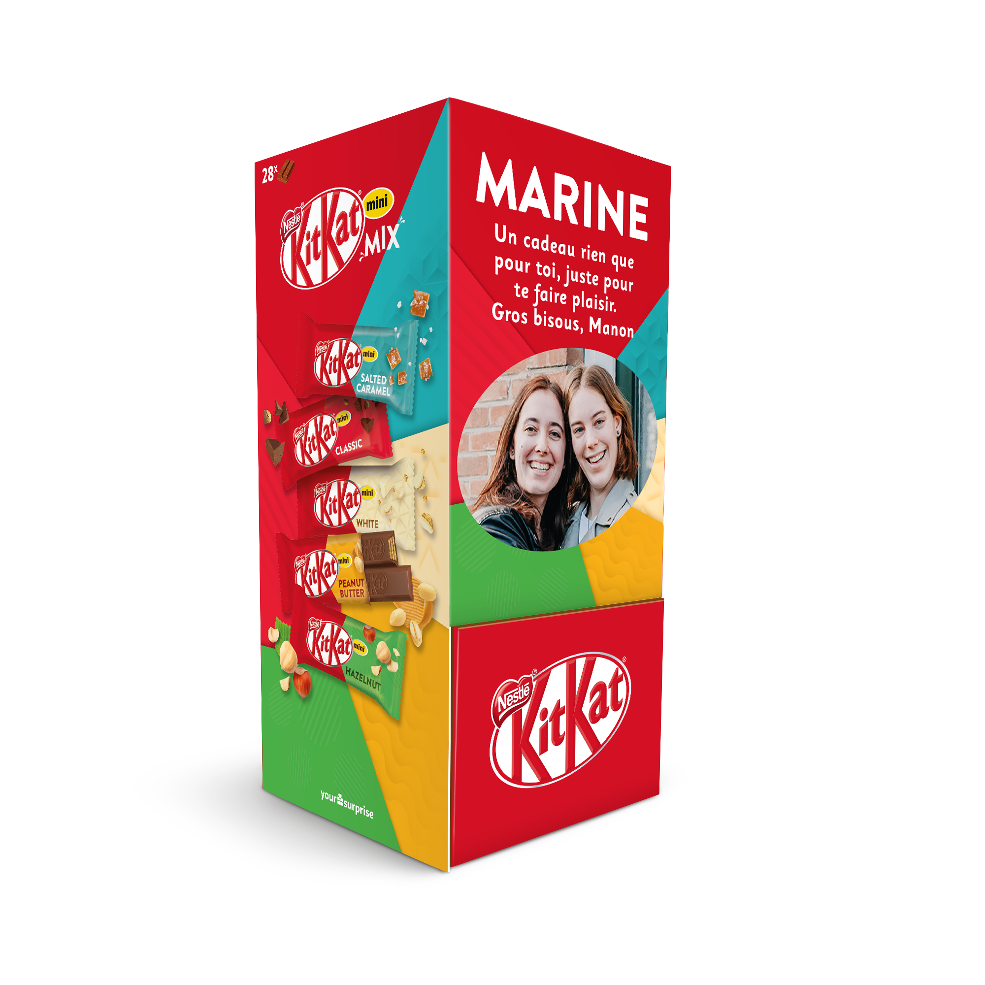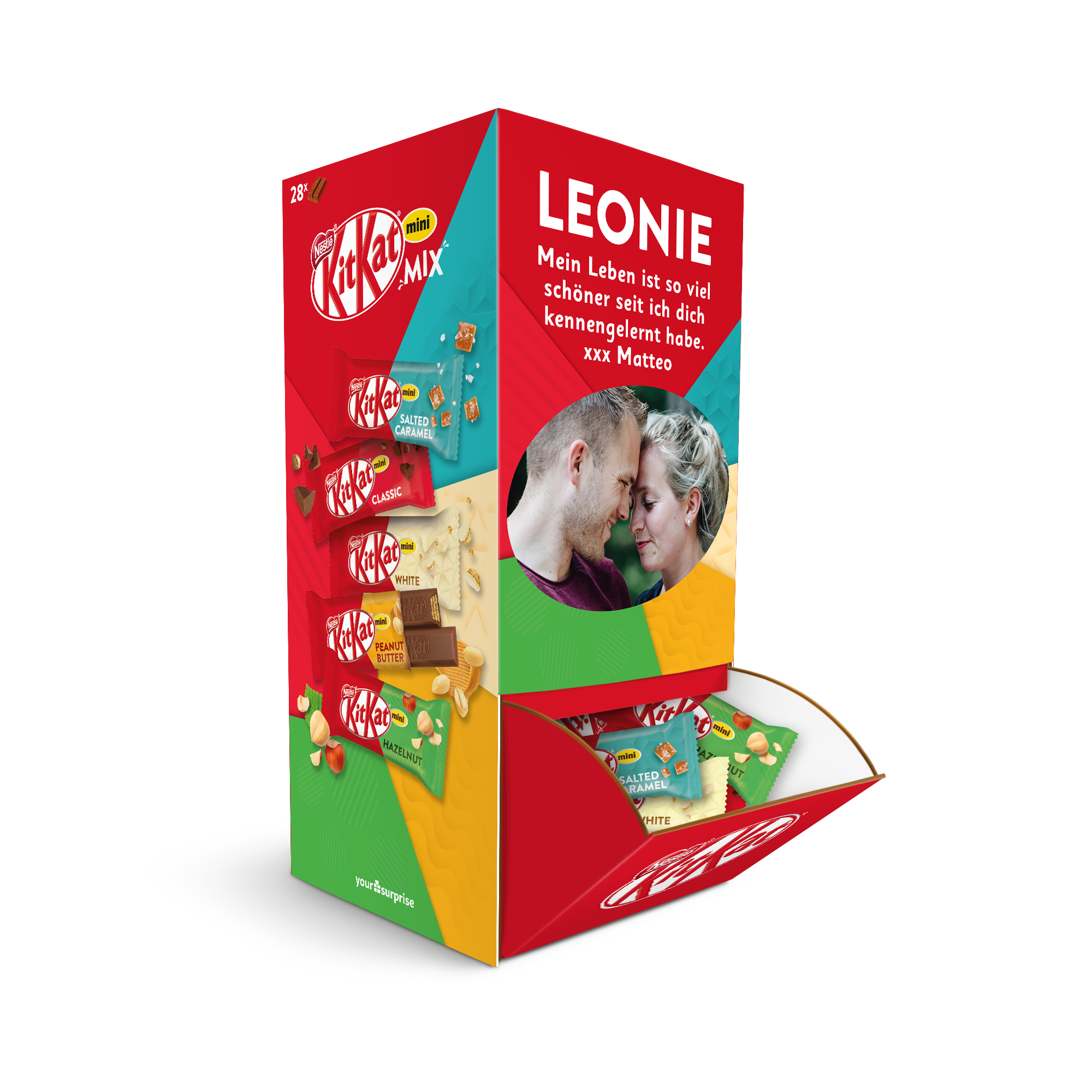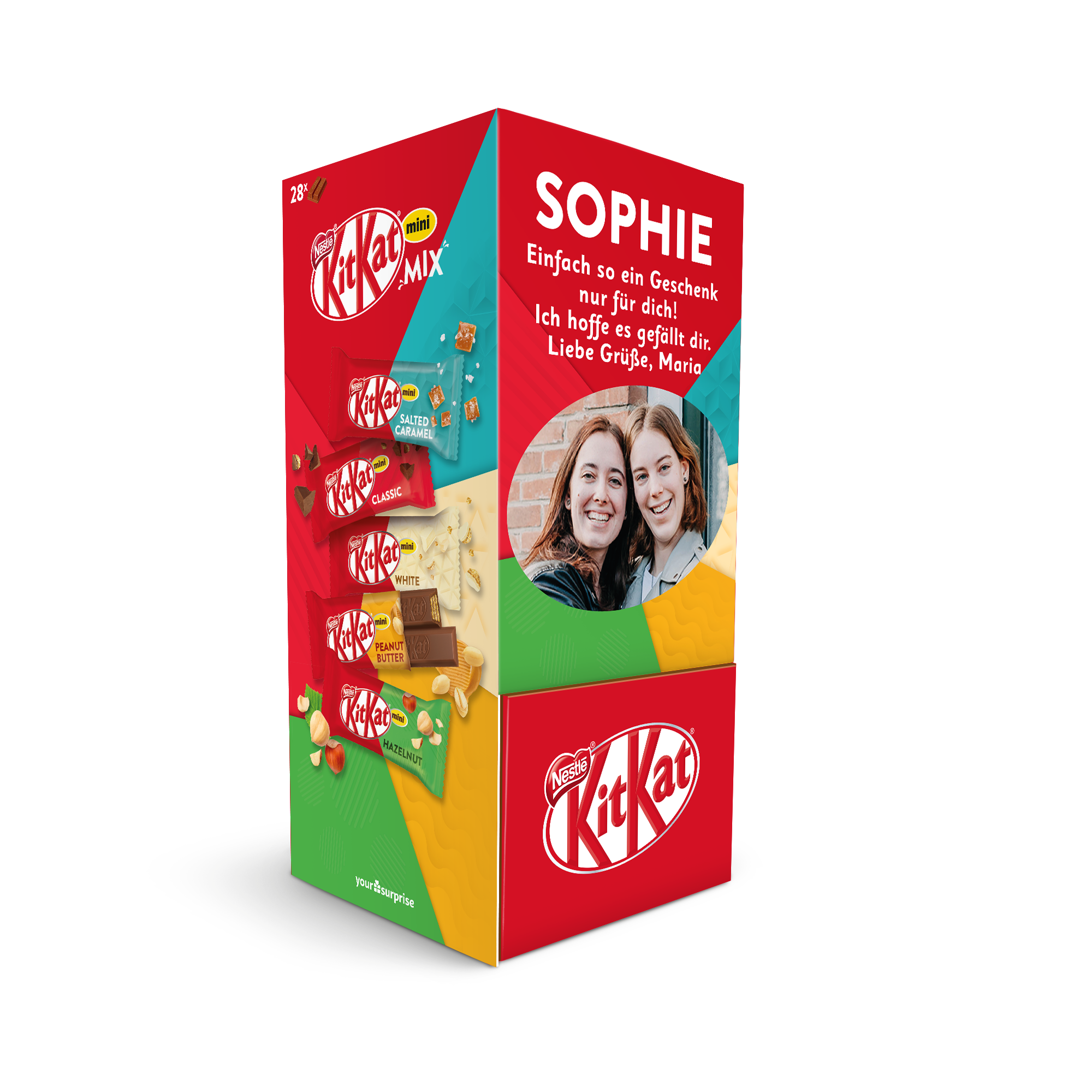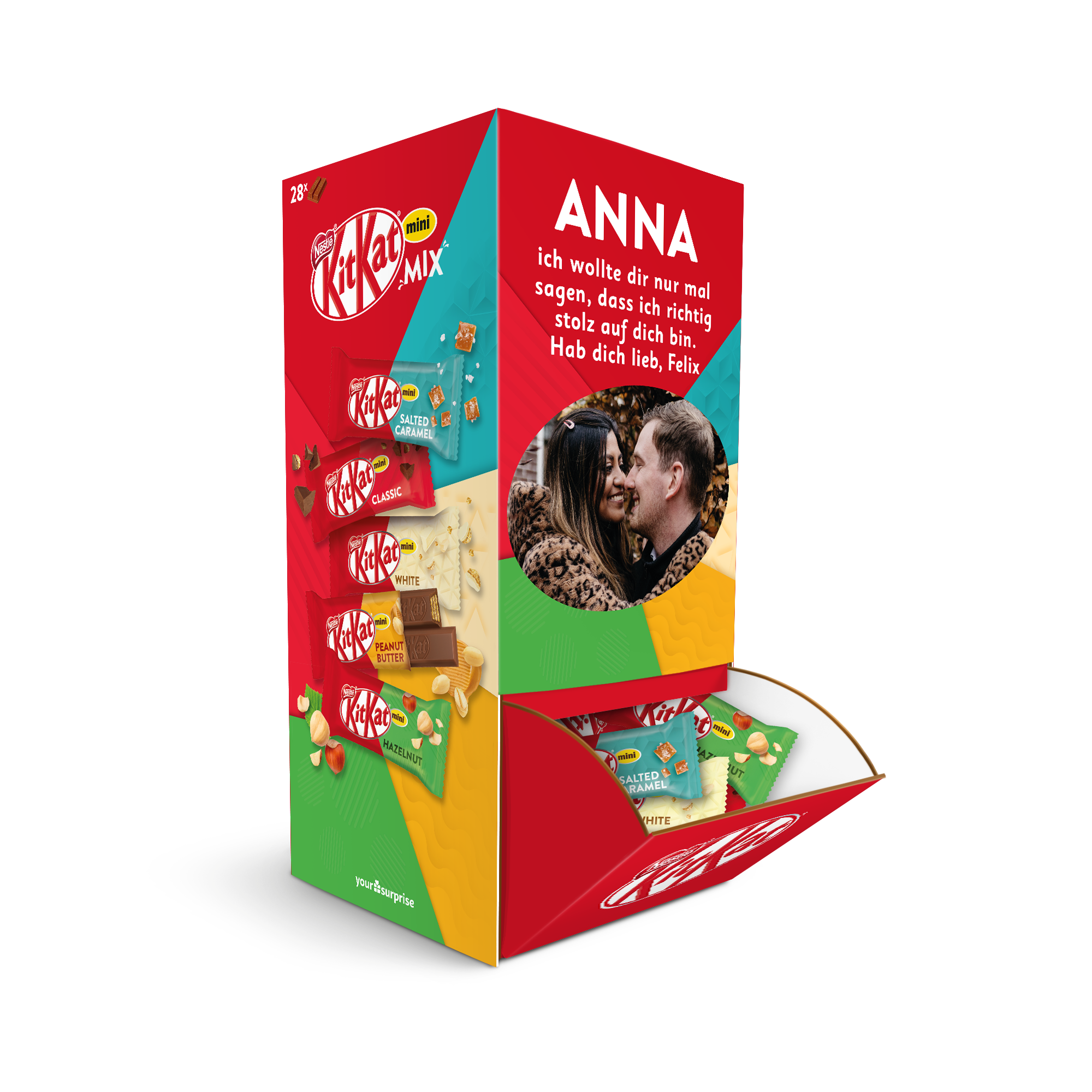 La confezione KitKat Mini Mix contiene 28 cioccolatini in 5 gusti. Personalizzabile con una foto e/o un testo. Ideale per i golosoni!Ulteriori informazioni sul KitKat Mini Mix: Dimensioni della scatola: 23 x 10,6 x 10,6 cmContenuto: 28 pezzi (394,8 g e)Peso: 475 grammiPersonalizzazione: nome, foto e/o testoStampa: nitida e a coloriExtra: conservare al fresco e all'asciutto.Purtroppo, in caso di temperature tropicali superiori a 25 gradi, non possiamo garantire che riceverete il vostro regalo di cioccolato in perfette condizioni. Ci sono domande? In tal caso, si prega di contattare il nostro servizio clienti. KitKat Mini Mix:Classico: wafer croccante ricoperto di cioccolato al latte (68,9%). Bianco: wafer croccante ricoperto di cioccolato bianco (68,9%). Nocciola: wafer croccante ricoperto di cioccolato al latte (77,6%) e pezzi di nocciola (3%). Burro di arachidi: wafer croccante con ripieno di burro di arachidi (13,8%) ricoperto di cioccolato al latte (68,9%). Caramello salato: wafer croccante ricoperto di cioccolato al latte (75,8%) e caramello salato (5%).Ingredienti: zucchero, LATTE scremato in polvere, farina di FRUMENTO, burro di cacao¹, pasta di cacao¹, grassi vegetali (noci di palma e karité), grasso di LATTE anidro, LATTE in polvere, ARACHIDI tostate e macinate, pezzi di NOCCIOLE, BURRO, cacao magro¹, emulsionante (lecitine), sciroppo di glucosio, farina di ARACHIDI, ROOM, aromi naturali (con ARACHIDI), sale, agente lievitante (carbonati di sodio).Allergeni: latte, lattosio, cereali contenenti glutine, frumento, arachidi, frutta a guscio, noccioleProdotto da: Nestlé Deutschland AG, 60523 Francoforte sul Meno, Germania