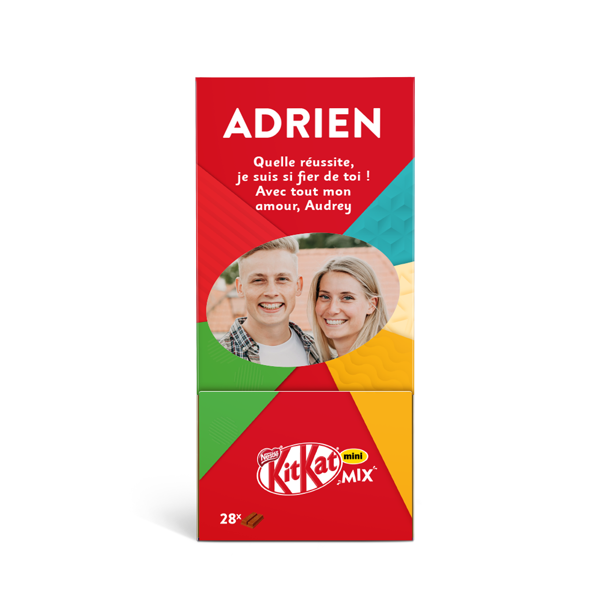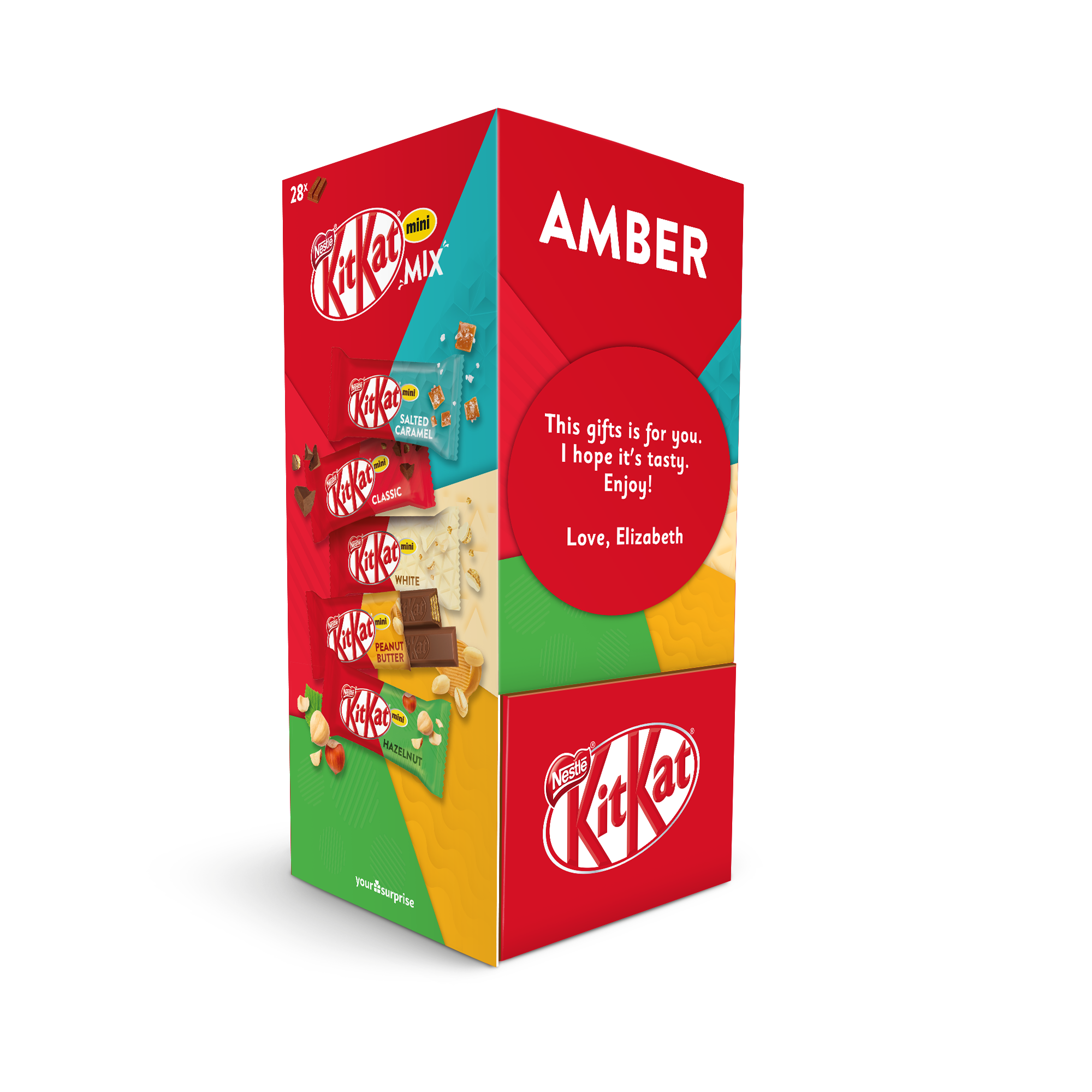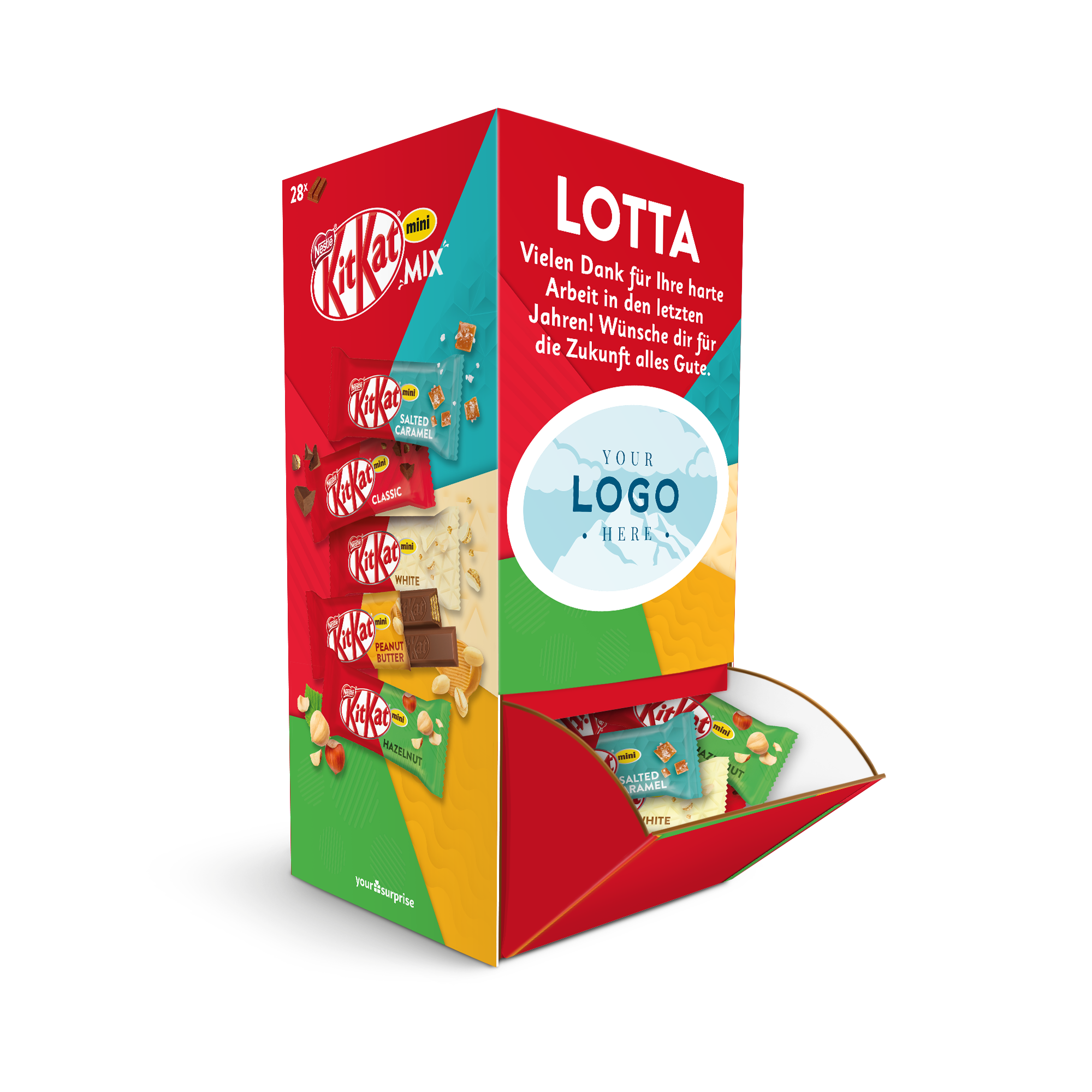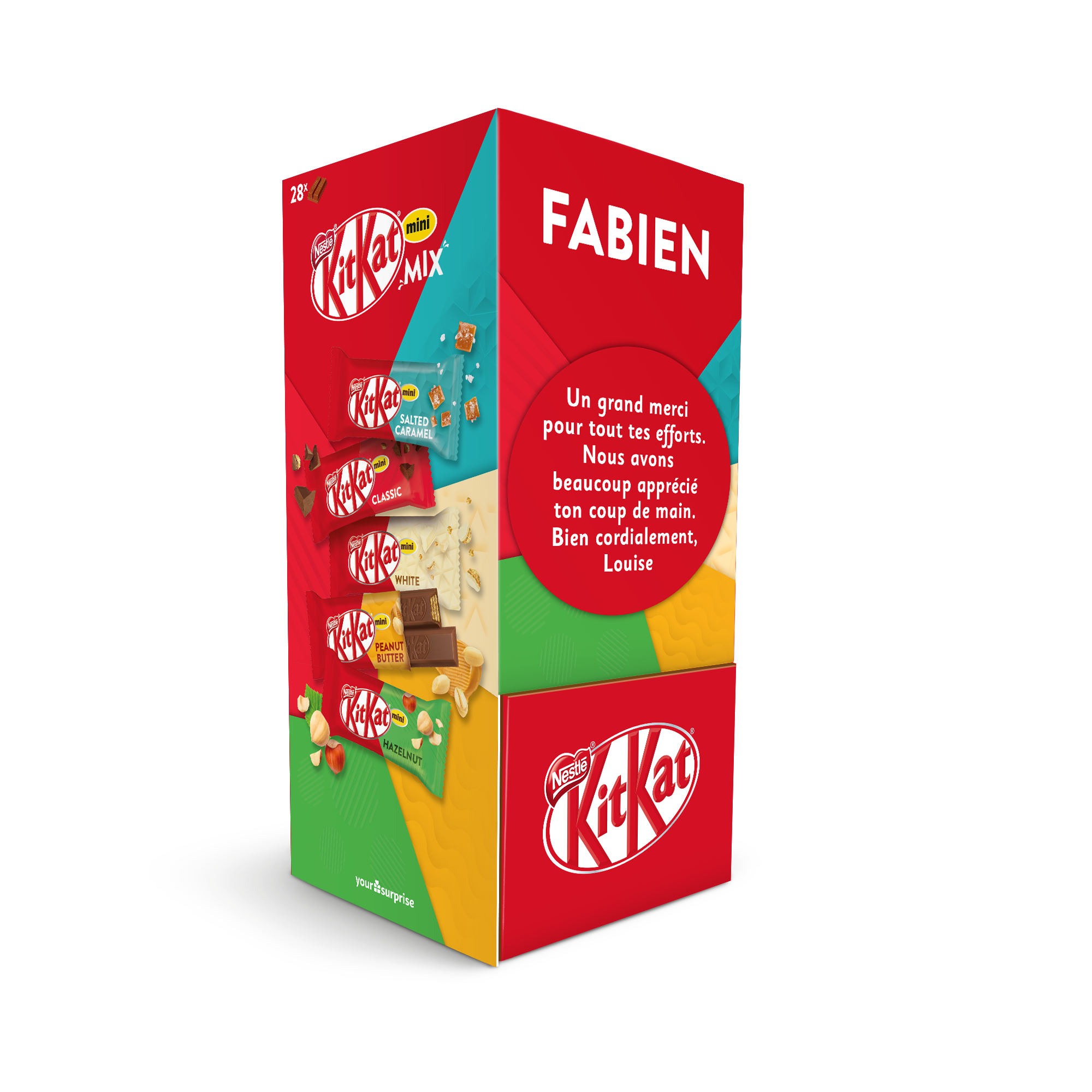 La confezione KitKat Mini Mix contiene 28 cioccolatini in 5 gusti. Personalizzabile con una foto e/o un testo. Ideale per i golosoni!Ulteriori informazioni sul KitKat Mini Mix: Dimensioni della scatola: 23 x 10,6 x 10,6 cmContenuto: 28 pezzi (394,8 g e)Peso: 475 grammiPersonalizzazione: nome, foto e/o testoStampa: nitida e a coloriExtra: conservare al fresco e all'asciutto.Purtroppo, in caso di temperature tropicali superiori a 25 gradi, non possiamo garantire che riceverete il vostro regalo di cioccolato in perfette condizioni. Ci sono domande? In tal caso, si prega di contattare il nostro servizio clienti. KitKat Mini Mix:Classico: wafer croccante ricoperto di cioccolato al latte (68,9%). Bianco: wafer croccante ricoperto di cioccolato bianco (68,9%). Nocciola: wafer croccante ricoperto di cioccolato al latte (77,6%) e pezzi di nocciola (3%). Burro di arachidi: wafer croccante con ripieno di burro di arachidi (13,8%) ricoperto di cioccolato al latte (68,9%). Caramello salato: wafer croccante ricoperto di cioccolato al latte (75,8%) e caramello salato (5%).Ingredienti: zucchero, LATTE scremato in polvere, farina di FRUMENTO, burro di cacao¹, pasta di cacao¹, grassi vegetali (noci di palma e karité), grasso di LATTE anidro, LATTE in polvere, ARACHIDI tostate e macinate, pezzi di NOCCIOLE, BURRO, cacao magro¹, emulsionante (lecitine), sciroppo di glucosio, farina di ARACHIDI, ROOM, aromi naturali (con ARACHIDI), sale, agente lievitante (carbonati di sodio).Allergeni: latte, lattosio, cereali contenenti glutine, frumento, arachidi, frutta a guscio, noccioleProdotto da: Nestlé Deutschland AG, 60523 Francoforte sul Meno, Germania