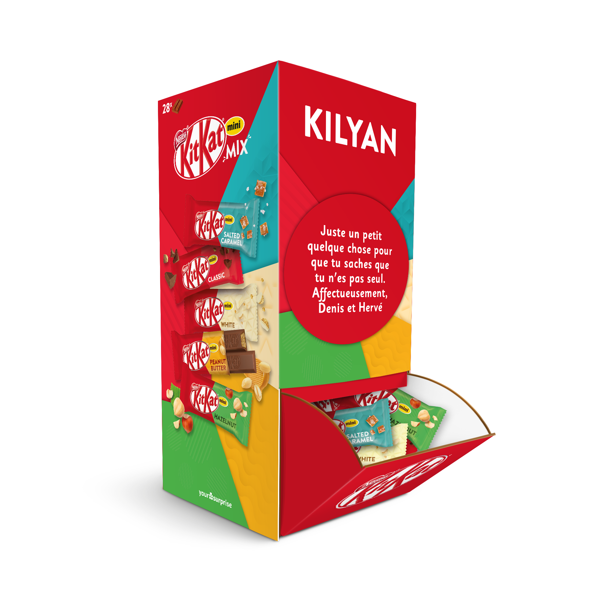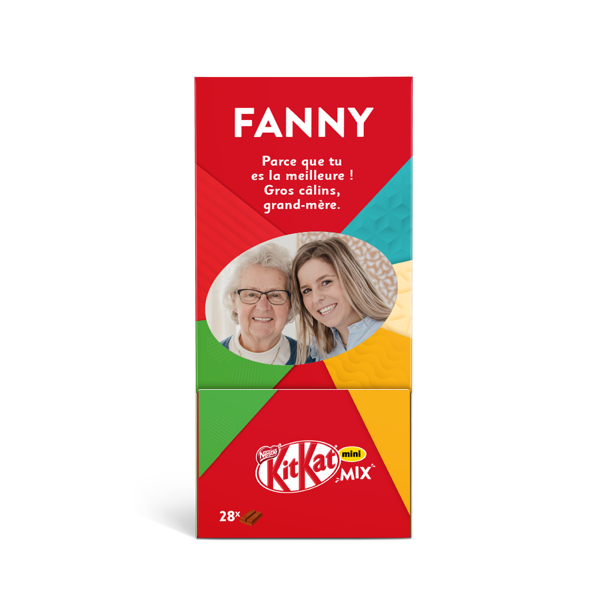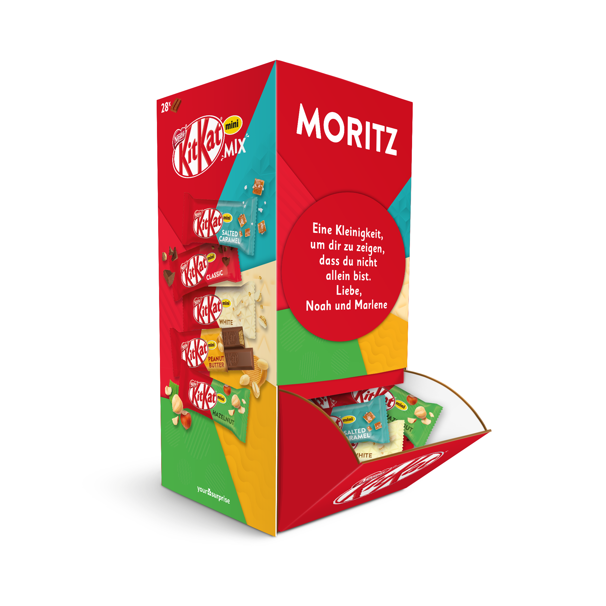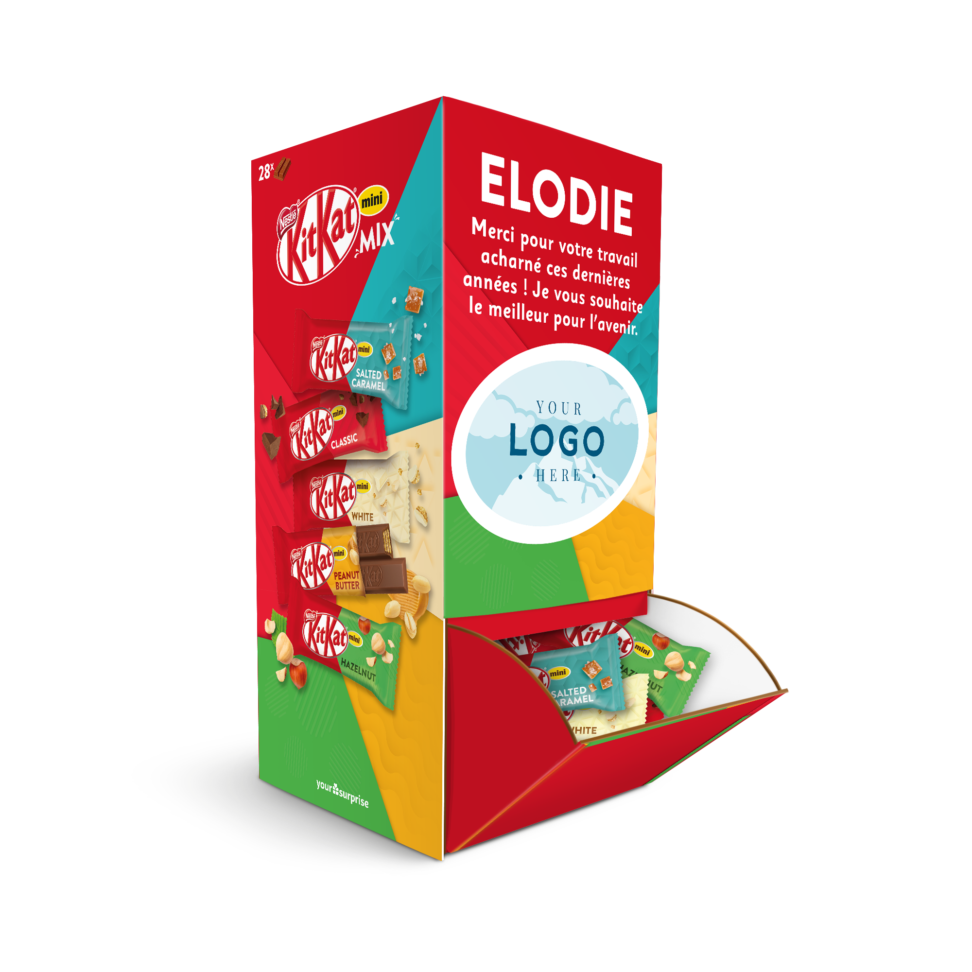 La confezione KitKat Mini Mix contiene 28 cioccolatini in 5 gusti. Personalizzabile con una foto e/o un testo. Ideale per i golosoni!Ulteriori informazioni sul KitKat Mini Mix: Dimensioni della scatola: 23 x 10,6 x 10,6 cmContenuto: 28 pezzi (394,8 g e)Peso: 475 grammiPersonalizzazione: nome, foto e/o testoStampa: nitida e a coloriExtra: conservare al fresco e all'asciutto.Purtroppo, in caso di temperature tropicali superiori a 25 gradi, non possiamo garantire che riceverete il vostro regalo di cioccolato in perfette condizioni. Ci sono domande? In tal caso, si prega di contattare il nostro servizio clienti. KitKat Mini Mix:Classico: wafer croccante ricoperto di cioccolato al latte (68,9%). Bianco: wafer croccante ricoperto di cioccolato bianco (68,9%). Nocciola: wafer croccante ricoperto di cioccolato al latte (77,6%) e pezzi di nocciola (3%). Burro di arachidi: wafer croccante con ripieno di burro di arachidi (13,8%) ricoperto di cioccolato al latte (68,9%). Caramello salato: wafer croccante ricoperto di cioccolato al latte (75,8%) e caramello salato (5%).Ingredienti: zucchero, LATTE scremato in polvere, farina di FRUMENTO, burro di cacao¹, pasta di cacao¹, grassi vegetali (noci di palma e karité), grasso di LATTE anidro, LATTE in polvere, ARACHIDI tostate e macinate, pezzi di NOCCIOLE, BURRO, cacao magro¹, emulsionante (lecitine), sciroppo di glucosio, farina di ARACHIDI, ROOM, aromi naturali (con ARACHIDI), sale, agente lievitante (carbonati di sodio).Allergeni: latte, lattosio, cereali contenenti glutine, frumento, arachidi, frutta a guscio, noccioleProdotto da: Nestlé Deutschland AG, 60523 Francoforte sul Meno, Germania
