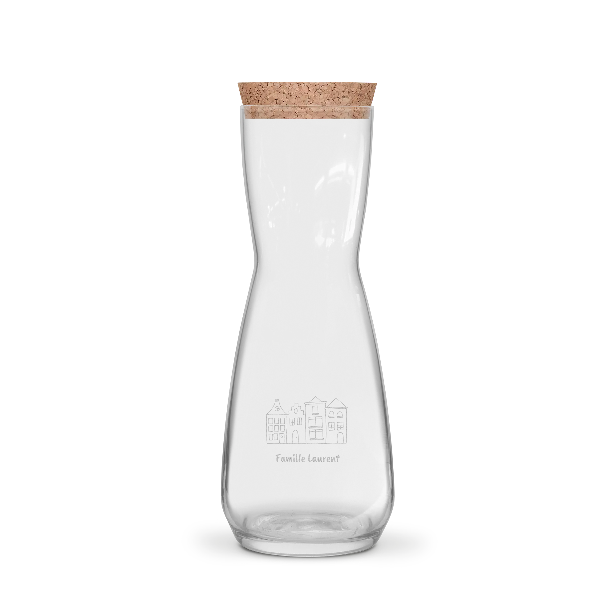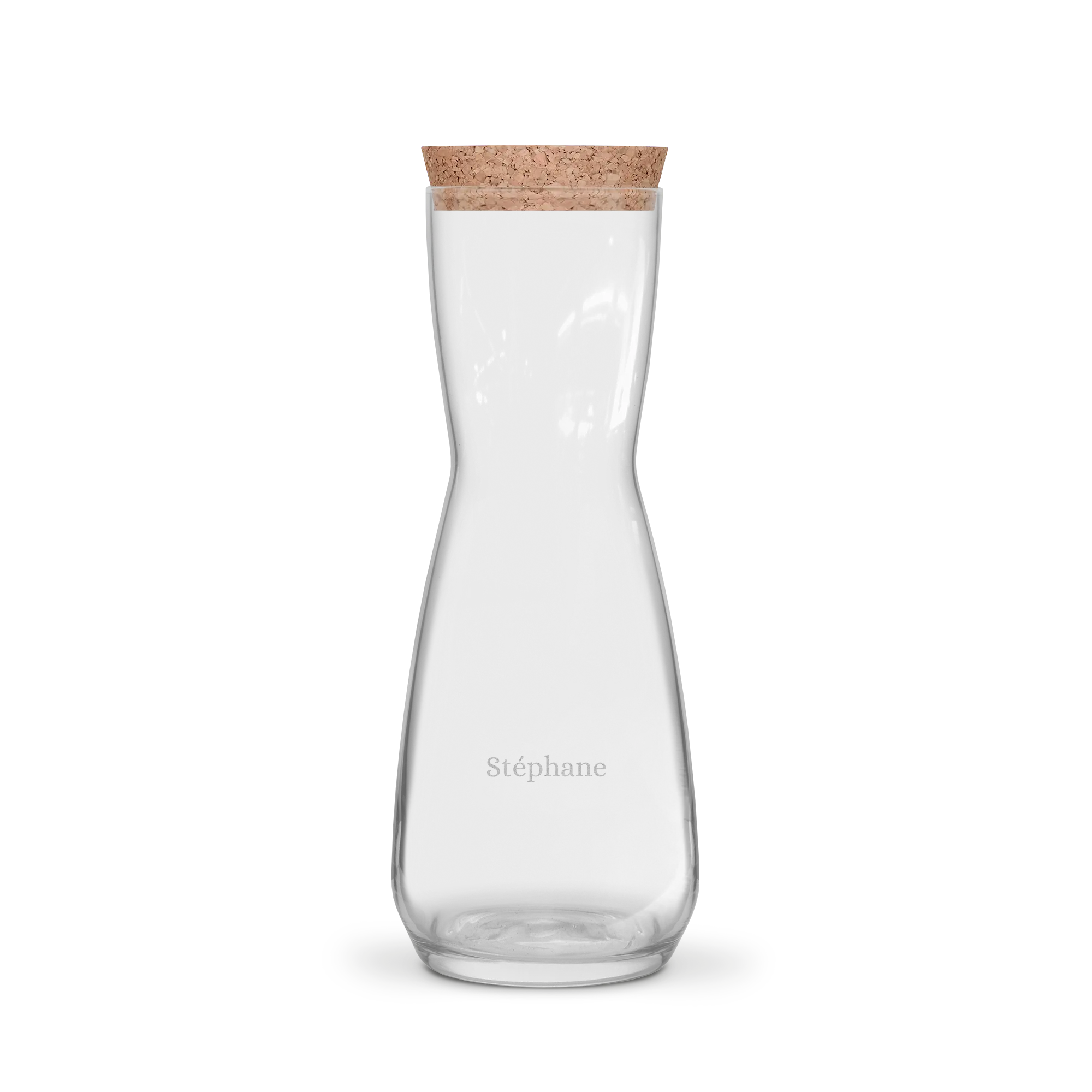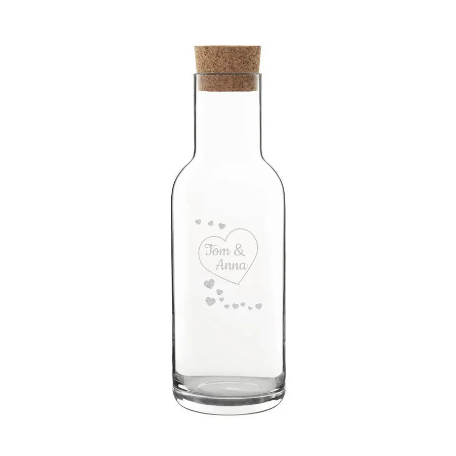 Caraffa con incisioni uniche con un nome e / o un testo. Adatto a tutti i tipi di bevande con un elegante tappo in sughero.Maggiori informazioni: Diametro: 8,5 cm Altezza: 26,5 cm Contenuto: 1l Chiusura: tappo in sughero Incisione: nome o testo; bianca (il risultato finale potrebbe essere differente dal'immagine mostrata)Lavorazione: incisione a laser di alta qualitàExtra: A prova di lavastoviglie (tranne il tappo)Vuoi incidere un logo sulla bottiglia e ti servono più di 18 pezzi? Contatta il nostro team b2b!