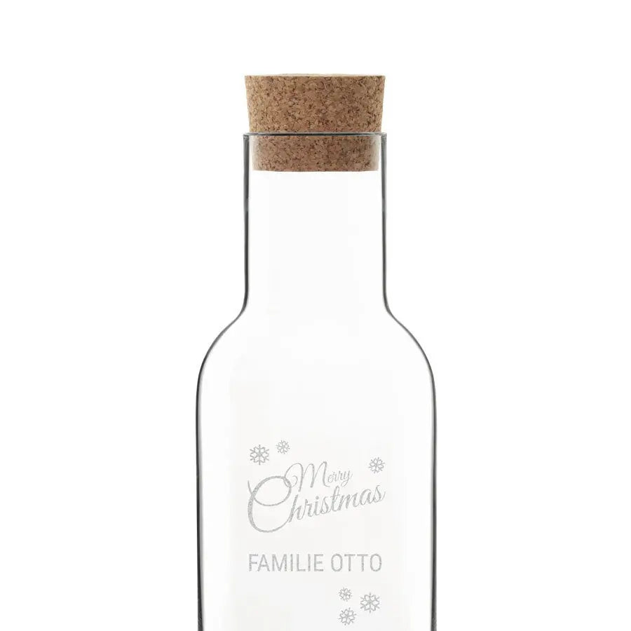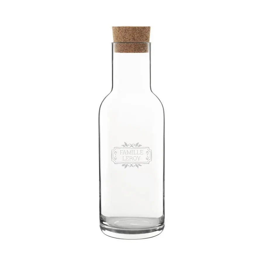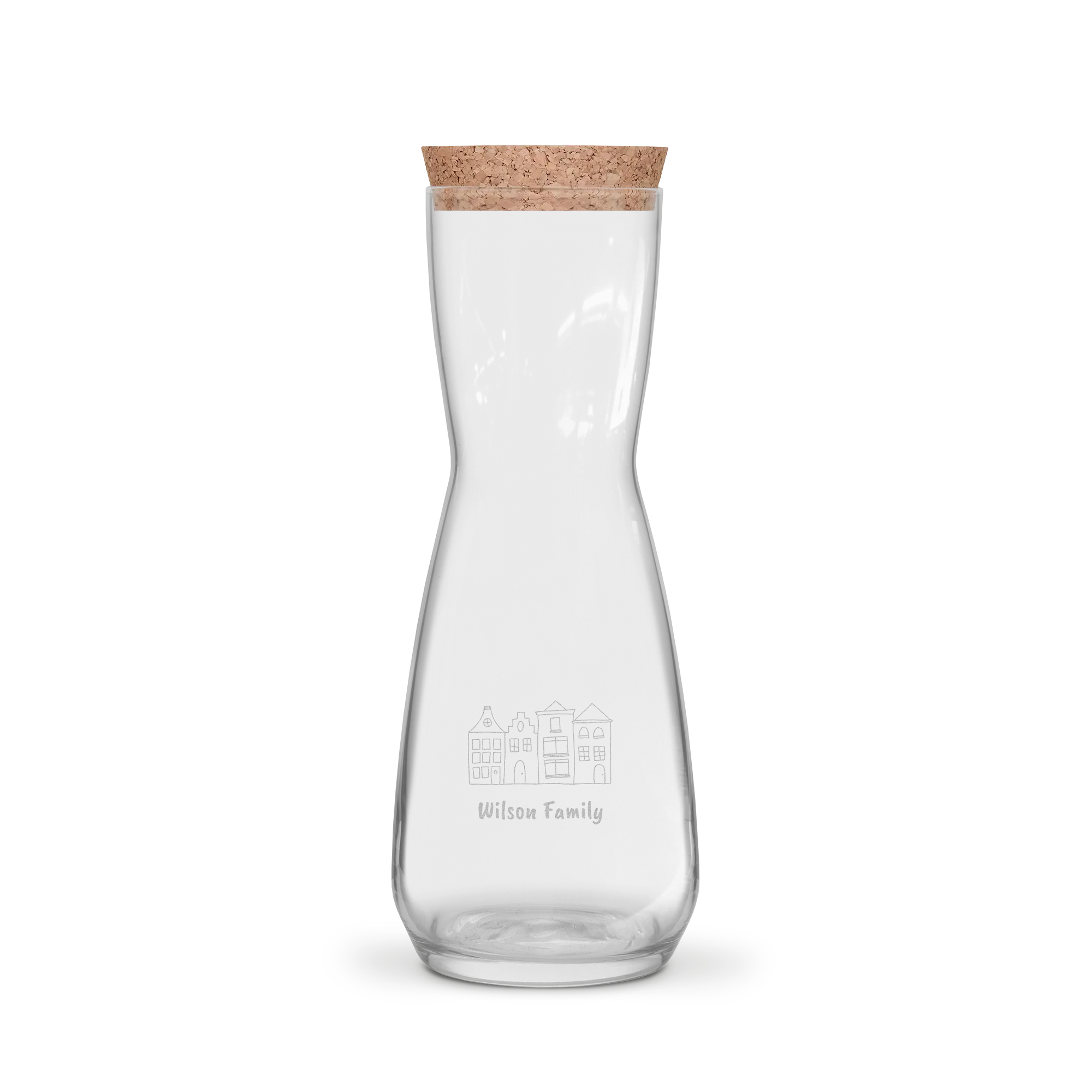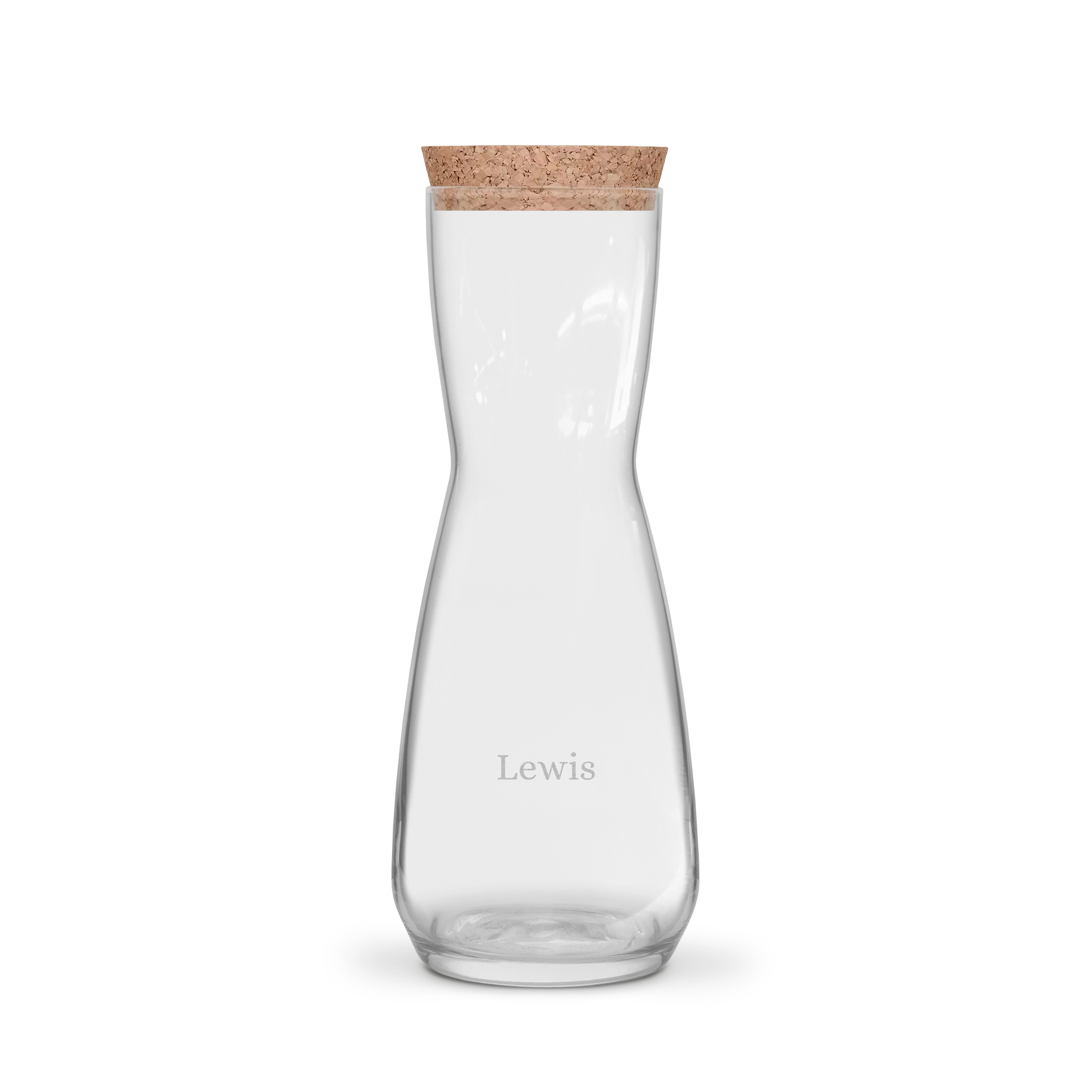 Caraffa con incisioni uniche con un nome e / o un testo. Adatto a tutti i tipi di bevande con un elegante tappo in sughero.Maggiori informazioni: Diametro: 8,5 cm Altezza: 26,5 cm Contenuto: 1l Chiusura: tappo in sughero Incisione: nome o testo; bianca (il risultato finale potrebbe essere differente dal'immagine mostrata)Lavorazione: incisione a laser di alta qualitàExtra: A prova di lavastoviglie (tranne il tappo)Vuoi incidere un logo sulla bottiglia e ti servono più di 18 pezzi? Contatta il nostro team b2b!