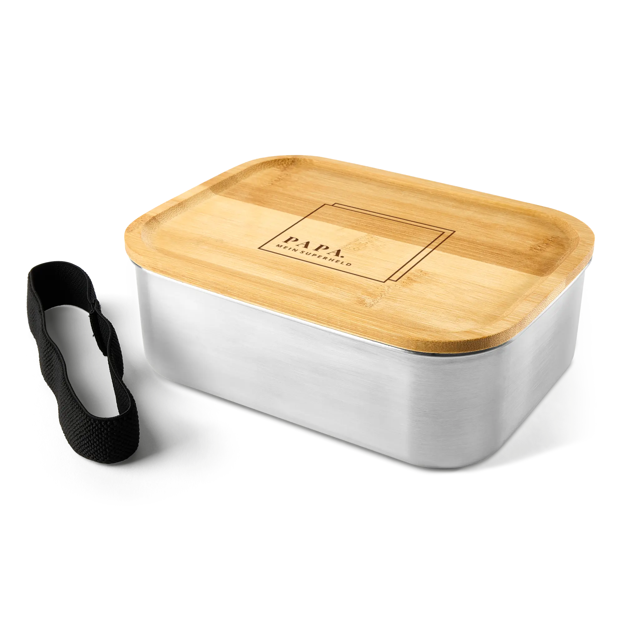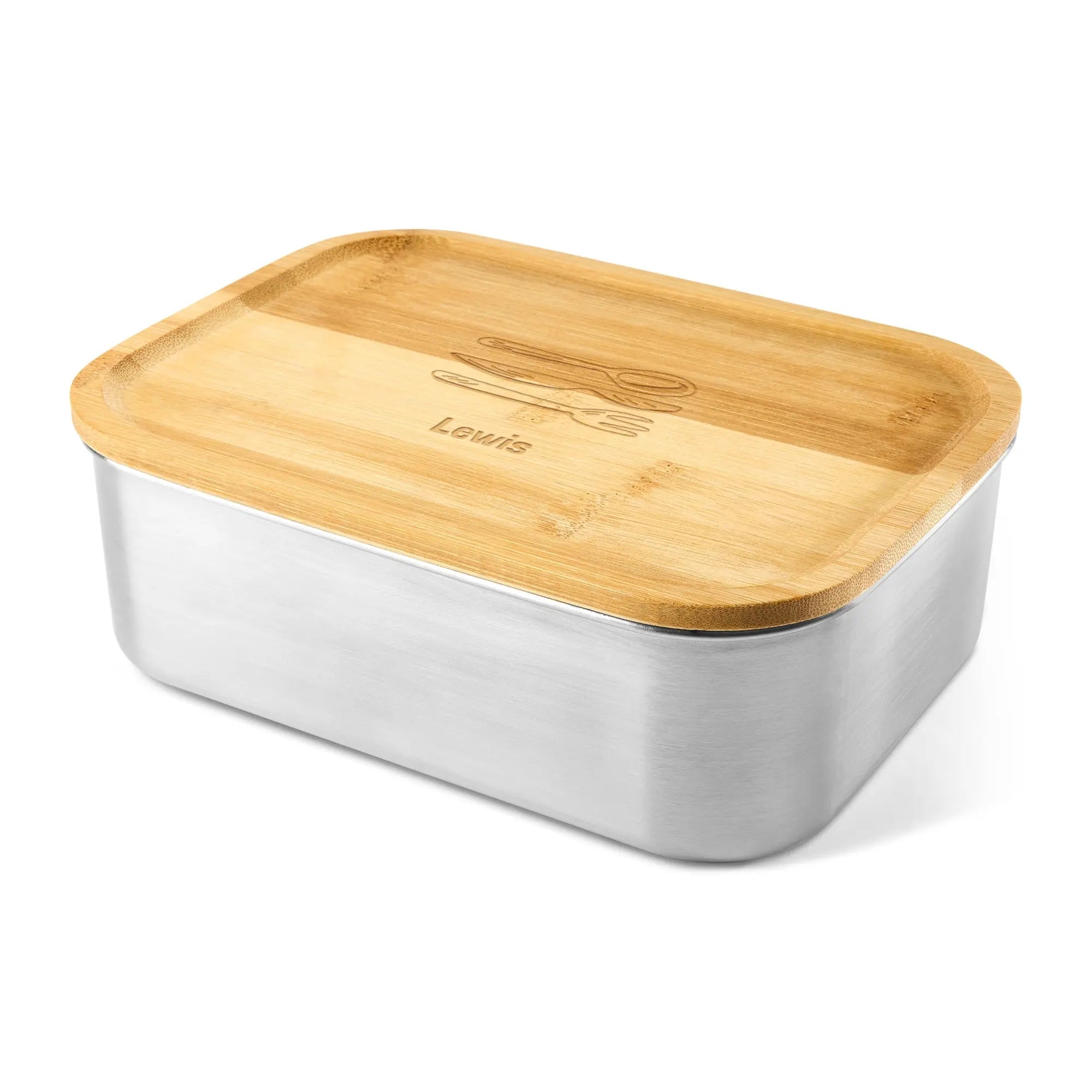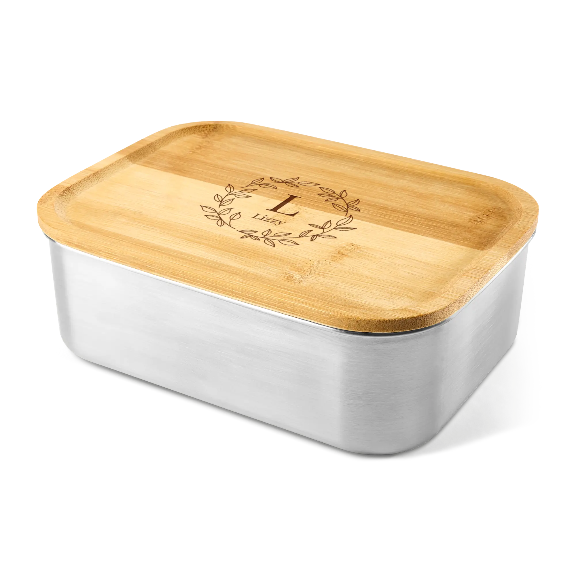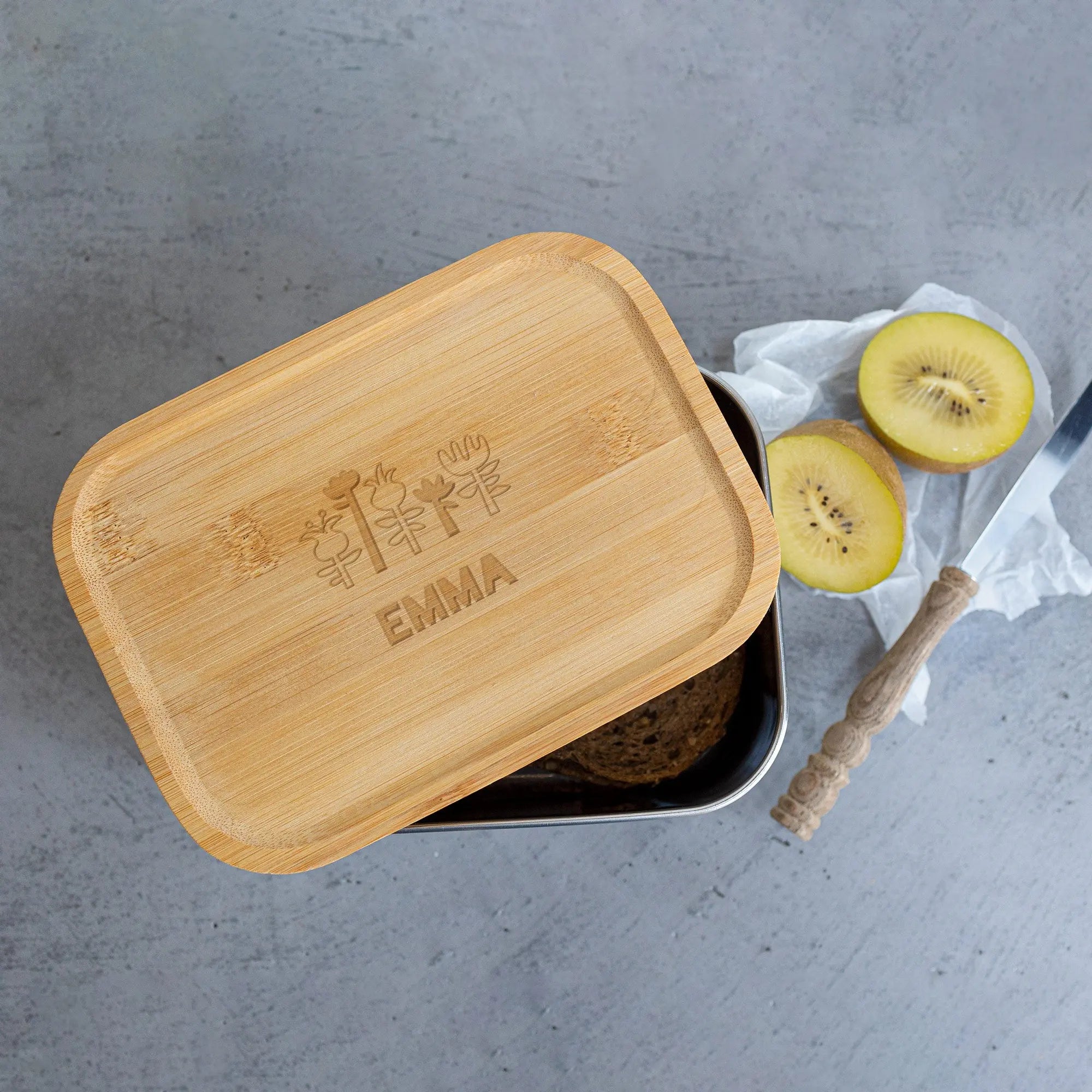 Un porta pranzo personalizzato con un nome o testo. Contenitore in acciaio inox e coperchio in bambù.Maggiori informazioni sul porta pranzo: Materiale del coperchio: bambùMateriale del contenitore: acciaio inoxDimensioni: 19 x 14 x 6.5 cm Personalizzazione: con nome o testo Metodo di personalizzazione: incisione di ottima qualità in color legno Informazioni aggiuntive: legno certificato FSC, lavaggio a mano. Si noti che il legno è un prodotto naturale, ciò significa che il regalo potrebbe risultare differente rispetto a quello mostrato nell'immagine di anteprima. Per ragioni techniche, non è possibile aggiungere caratteri cirillici, asiatici, arabi, greci, turchi o speciali.