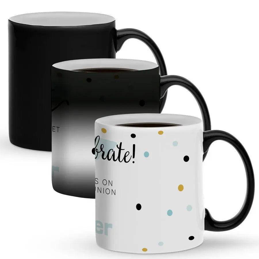 Una tazza magica con il tuo nome o un messaggio scelto da te. Oggetto unico: l'immagine appare solo dopo aver riempito la tazza con una bevanda calda! Una favolosa idea regalo!Ulteriori dettagli sulla tazza magica:Materiale: ceramicaAltezza: 9.5 cm / 3.7"Diametro: 8.2 cm / 3.2"Contenuto: 325 ml